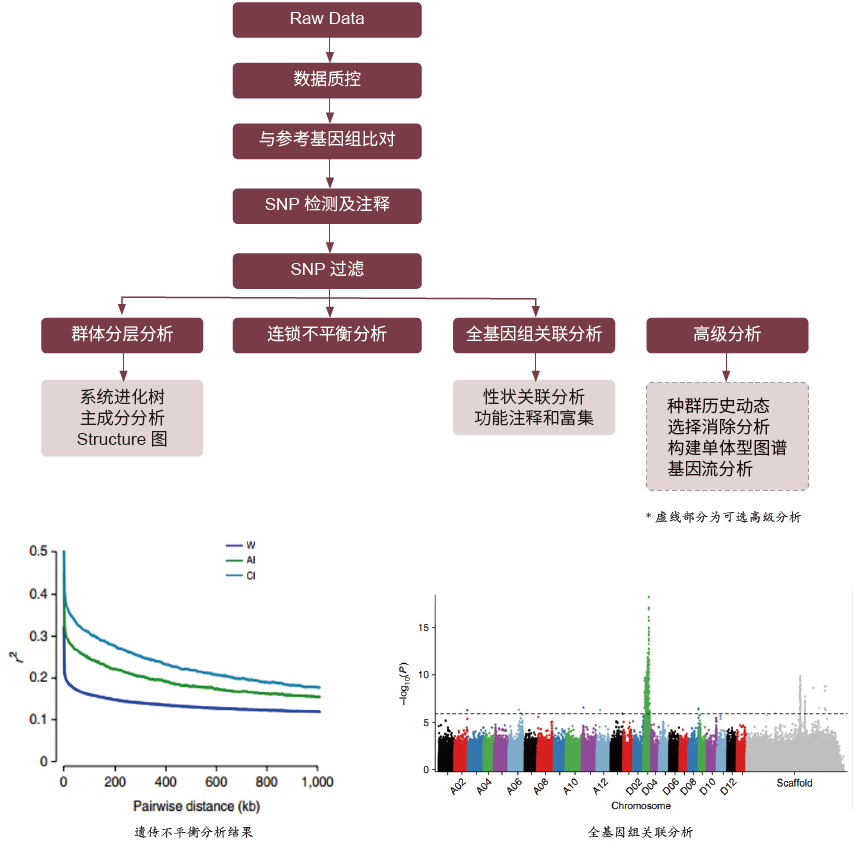 全基因组关联分析(Genome-wide association study,GWAS),是指对遗传多样性丰富的群体进行全基因组大样本重测序,在全基因组范围内找出存在的序列变异,即单核苷酸多态性(SNP),通过各种统计分析方法,从中筛选出与性状相关的 SNPs。GWAS 可快速准确地实现多个目标性状基因的高效定位,进一步获得与这些性状关联的候选基因或基因组区域,具有材料来源广、遗传变异多、性状定位全的优势。