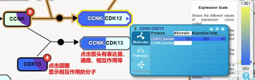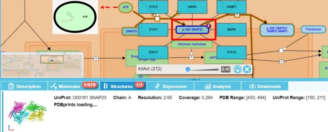 选中感兴趣的分子,该分子会标记为蓝框,可在“Structures”查看分子的高级结构,右上角圆圈里的7代表相互作用的分子数据,点击可以查看这些作用分子的详细信息,并可通过confident score依据相互作用强弱对相互作用分子进行筛选。当用鼠标滚轮将图片放得足够大时,可以看到分子的结构信息,如图中ATP。