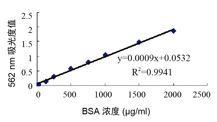 h 内即可完成蛋白质定量检测。本试剂盒含有牛血清白蛋白(BSA)溶液作为蛋白质标准溶液,测定范围为 20-2000 µg/ml。