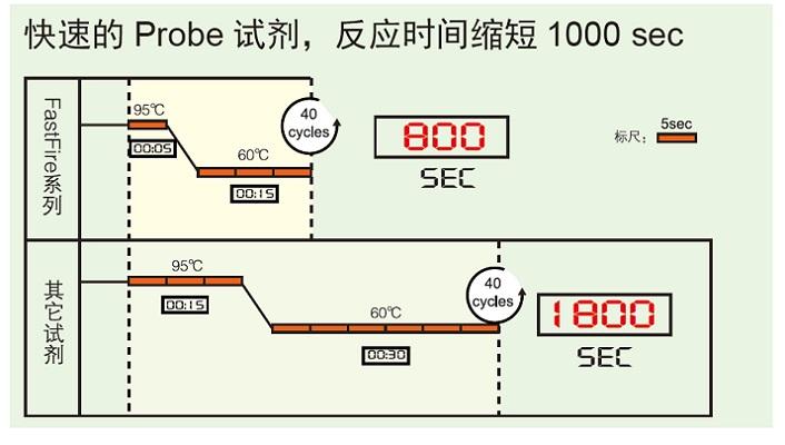 ■ 快速:FastFire 系列的探针法产品,采用了可快速激活的抗体修饰 Anti Taq DNA 聚合酶,配合独特的快速Buffer 体系,可节省多达 60% 的反应时间,成为目前市面上快速的 Probe 试剂。