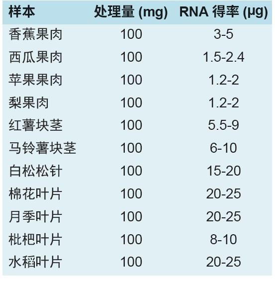 针对多糖多酚植物样本开发的一款硅基质纯化法 RNA 提取试剂盒。配有超强裂解能力的裂解液 SL,仅需 1 h 即可从香蕉、西瓜、苹果、梨等果肉,红薯、马铃薯等块茎,棉花、月季、枇杷、水稻等叶片及白松松针等植物样本中获得去除 gDNA 的高纯度总 RNA。