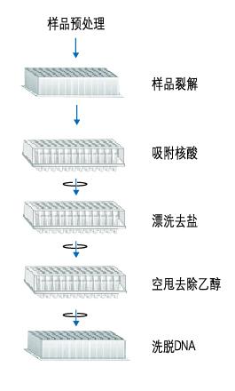 本试剂盒采用可以高效、专一结合 DNA 的离心吸附柱和独特的缓冲液系统,操作简单、快速,在短时间内即可完成 96 个不同血液样品 DNA 的提取。提取的基因组 DNA 可供基因检测或者组织分型、PCR、酶切和 Southern 杂交等实验操作。