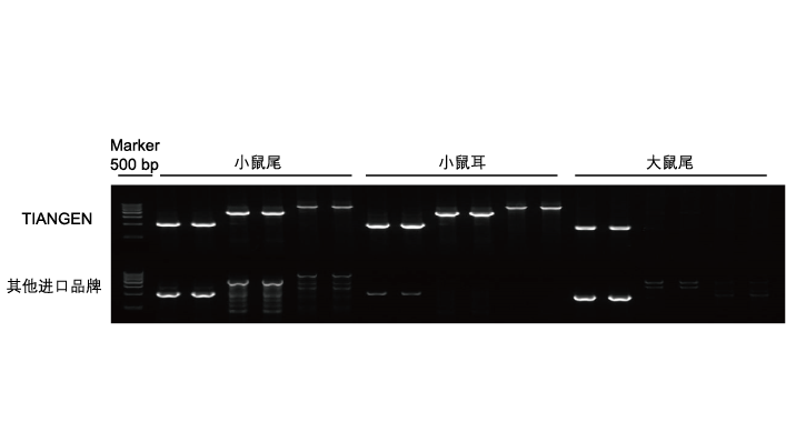 ■ 适用广泛:适用于从小鼠尾巴、耳朵以及脚趾等组织中一步法提取基因组 DNA。