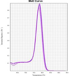 以miRbase Version 18收录的miRNA合成miRNA mimics(2x10^8copies)为模板,经过天根miRcute增强型miRNA cDNA第一链合成试剂盒(KR211)合成cDNA,10倍倍比稀释为5个梯度。利用天根miRcute增强型miRNA荧光定量检测试剂盒(FP411)和试剂盒中的下游引物以及引物库中的对应上有引物对hsa-miR-205-5p进行荧光定量检测,实验结果显示PCR扩增线性梯度良好,熔解曲线峰形单一特异,标准曲线显示扩增效率达96.25%。